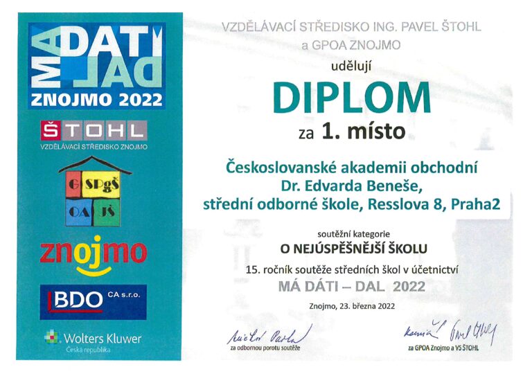 Ve dnech 22. a 23. března 2022 se 3 žákyně naší školy zúčastnily celostátní soutěže v účetních znalostech Má dáti – Dal Znojmo 2022. Máme ...